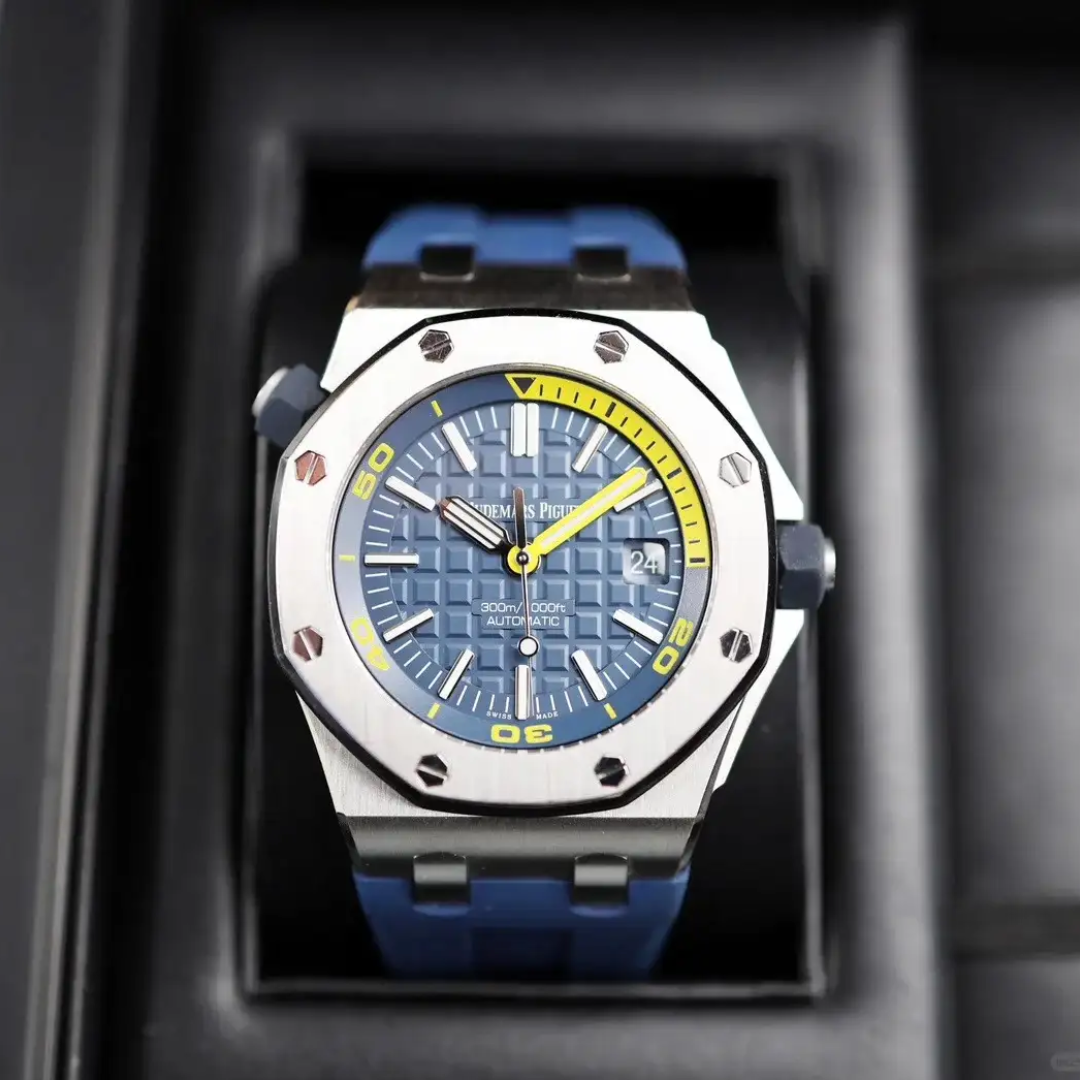 Dive into style and precision with the Audemars Piguet Offshore Diver 42mm, a certified authentic pre-owned timepiece designed for men who value performance and luxury. Featuring a bold blue Mega Tapisserie dial, luminous hands, and a date display at 3 o’clock, this watch combines sporty functionality with elegant design. The octagonal stainless steel case, screw-down crown, and octagonal bezel make it instantly recognizable, while the Swiss-tested automatic movement ensures accurate timekeeping for years to come. Paired with a durable rubber strap and pin buckle, this watch is perfect for everyday wear or aquatic adventures.