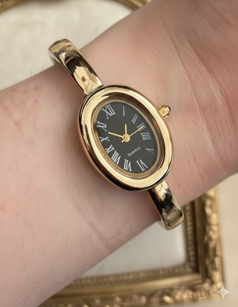 The gold-tone bangle bracelet completes the silhouette with a sophisticated and feminine wrist presence, making it a standout accessory for both daily wear and special occasions.