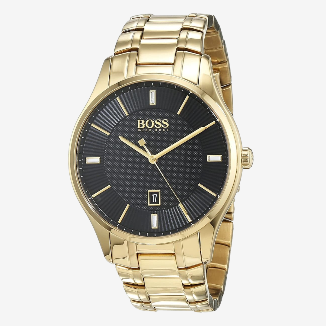 Elevate your everyday style with the Govenor Casual Sport 1513521 by BOSS. This gold-tone stainless steel watch combines luxury and practicality, featuring a black dial with crystal and gold-tone indices for a refined look. Designed with a slim 44mm case, it fits comfortably under dress shirts, making it perfect for work or special occasions.