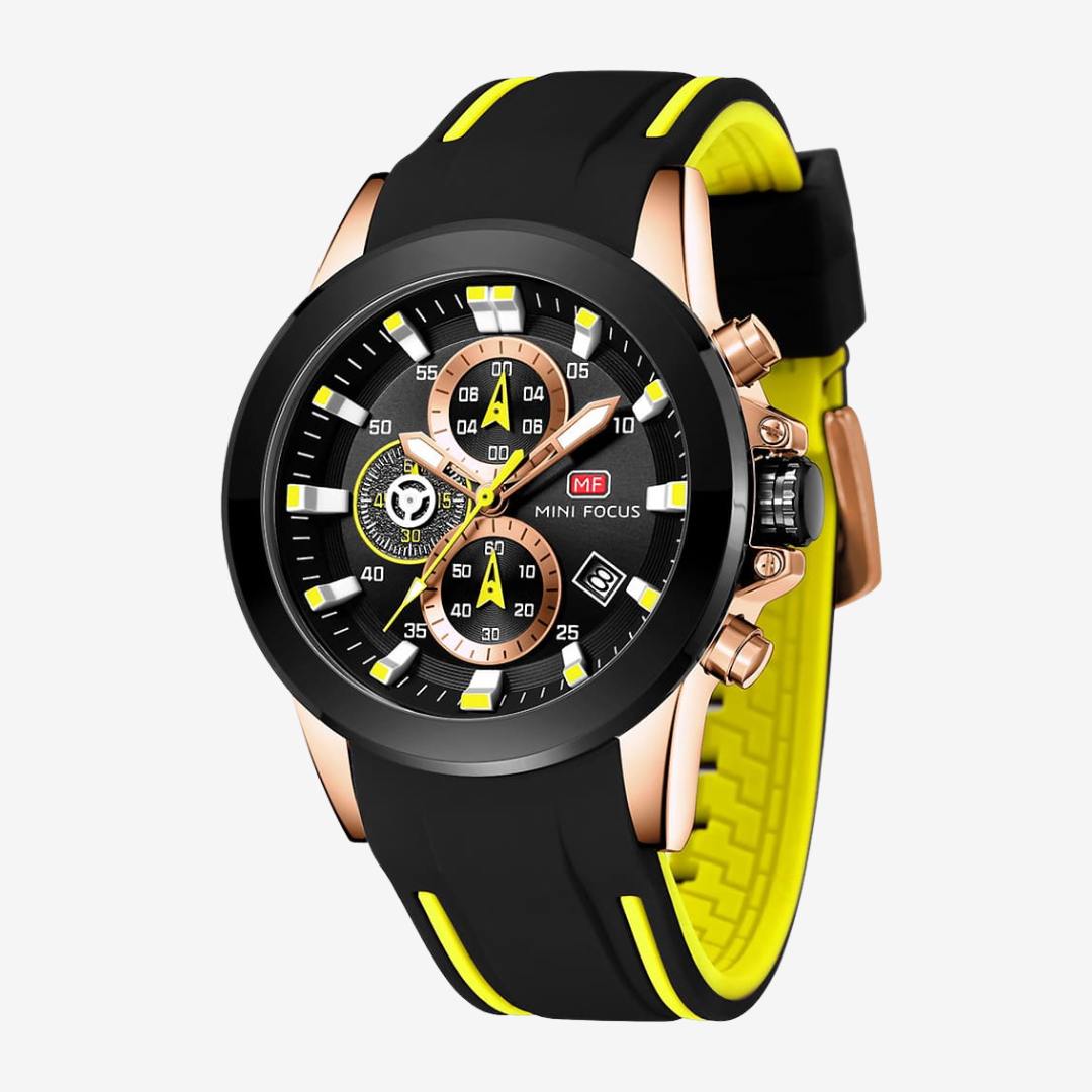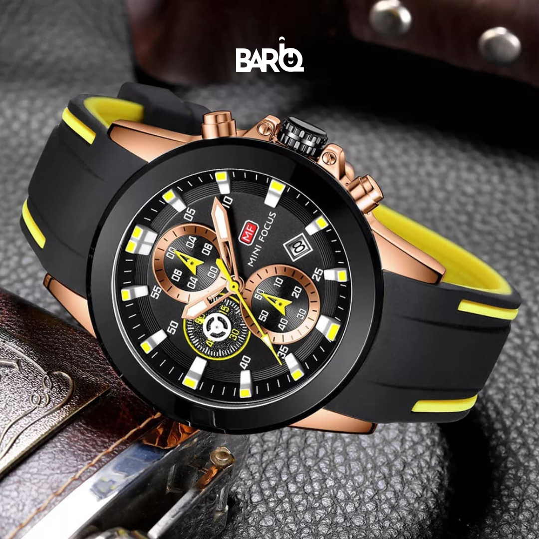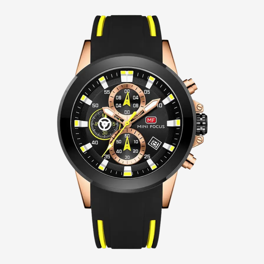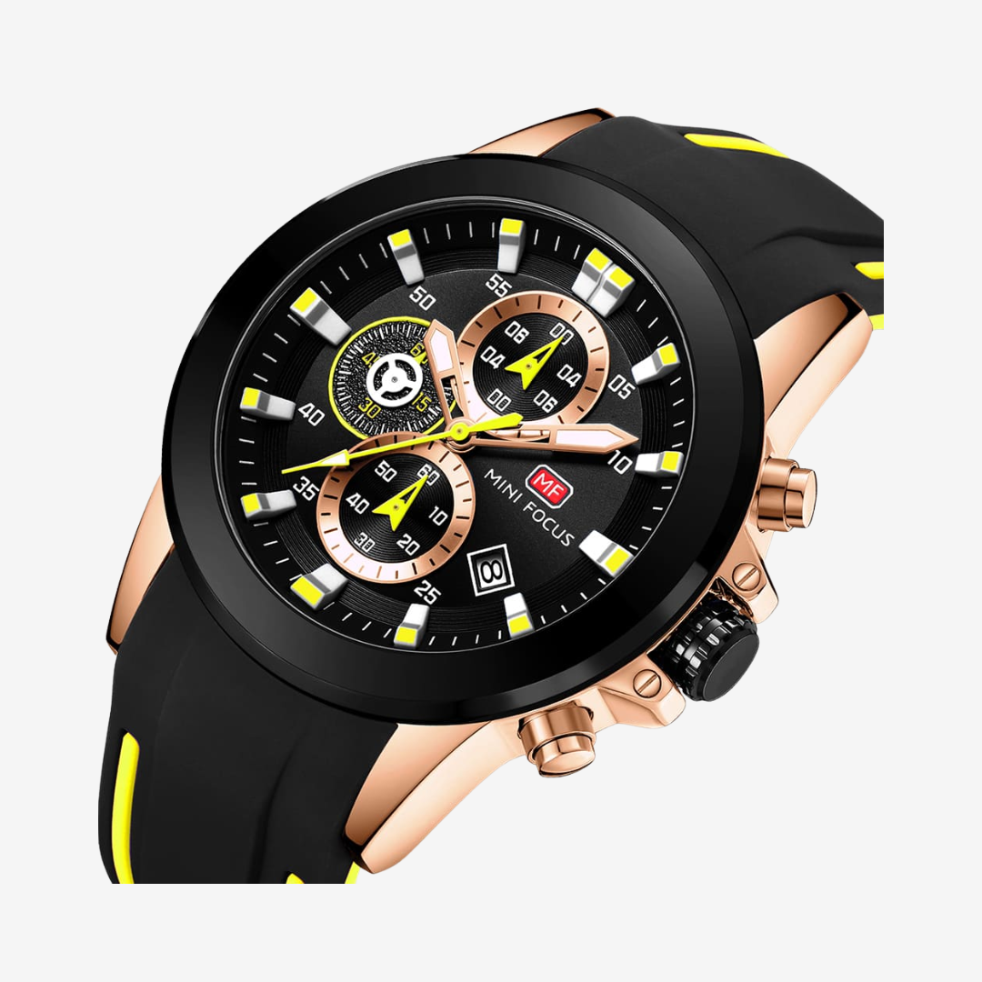 Stand out with the Mini Focus MF0287G Men’s Watch, featuring a bold and dynamic design that combines sporty functionality with modern style. The black multi-function dial with yellow accents and a comfortable black rubber strap make it perfect for daily wear and active lifestyles.