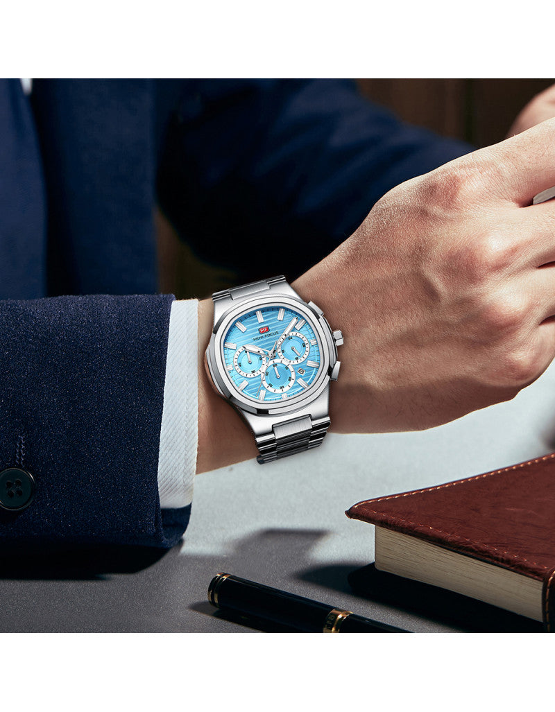Powered by a reliable quartz movement, it is protected by crystal glass and secured with a butterfly clasp. The 45mm case size delivers a strong wrist presence, making it suitable for daily wear and casual or sporty styles.