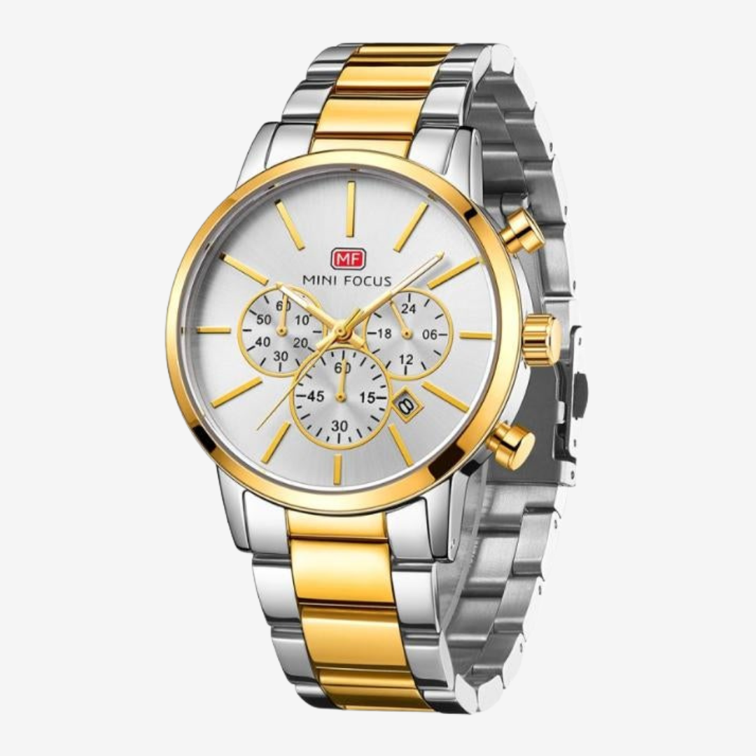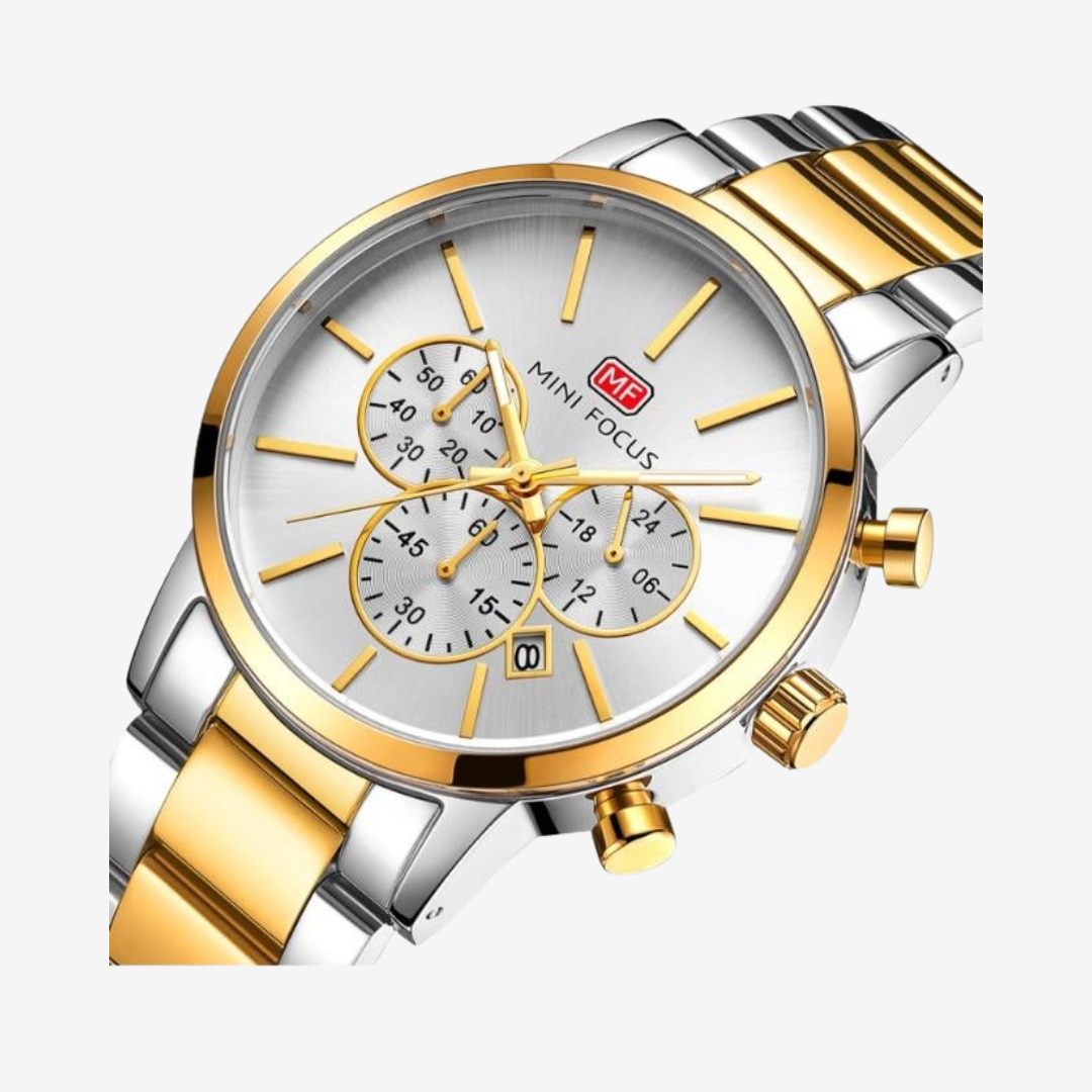 Step up your style with the Mini Focus MF0294G, a 44mm men’s watch designed to combine elegance and practicality. Featuring a polished silver and gold stainless steel case and bracelet, this original Mini Focus timepiece showcases a crisp white dial with chronograph subdials and date display. Powered by precise quartz movement, it delivers reliable timekeeping for everyday wear or special occasions.