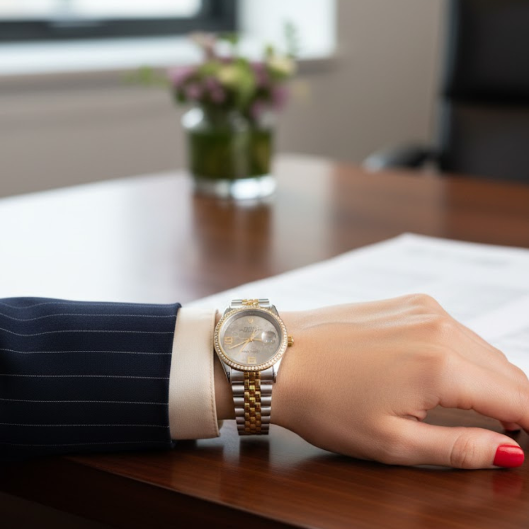 The crystal-set bezel enhances the luxurious feel, while the two-tone stainless steel bracelet in silver and gold offers durability, comfort, and a polished look. The iconic date window provides practical functionality, making this high-quality edition perfect for both everyday wear and special occasions.