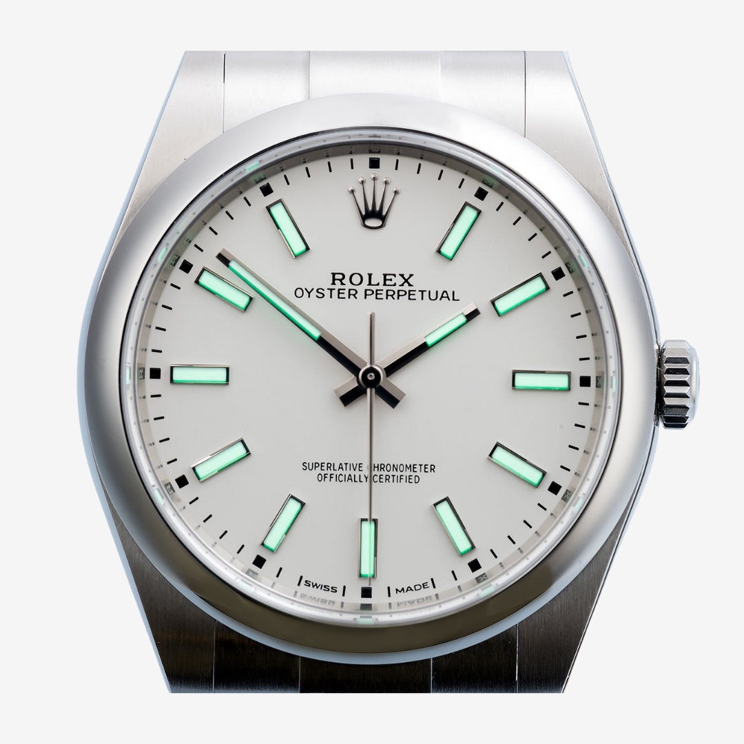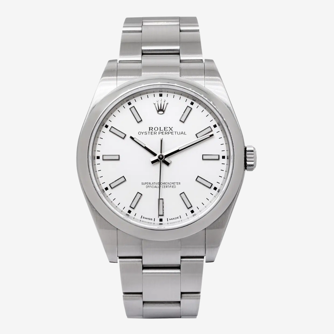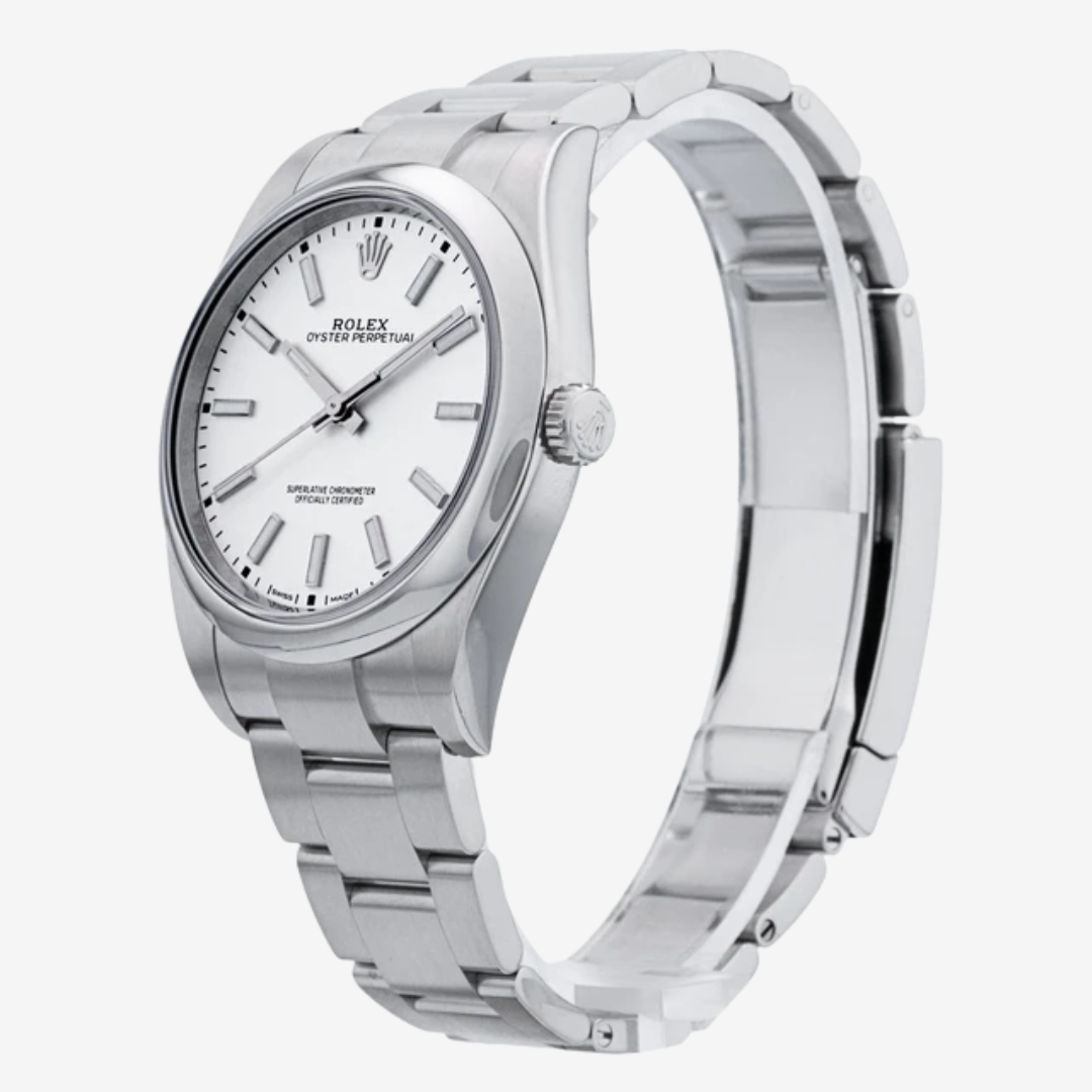 Discover classic style and precise performance with the Rolex Oyster Perpetual White Mirror Original. This 41mm watch features a sleek white mirror-finish dial for a versatile, elegant look that works for any occasion.
