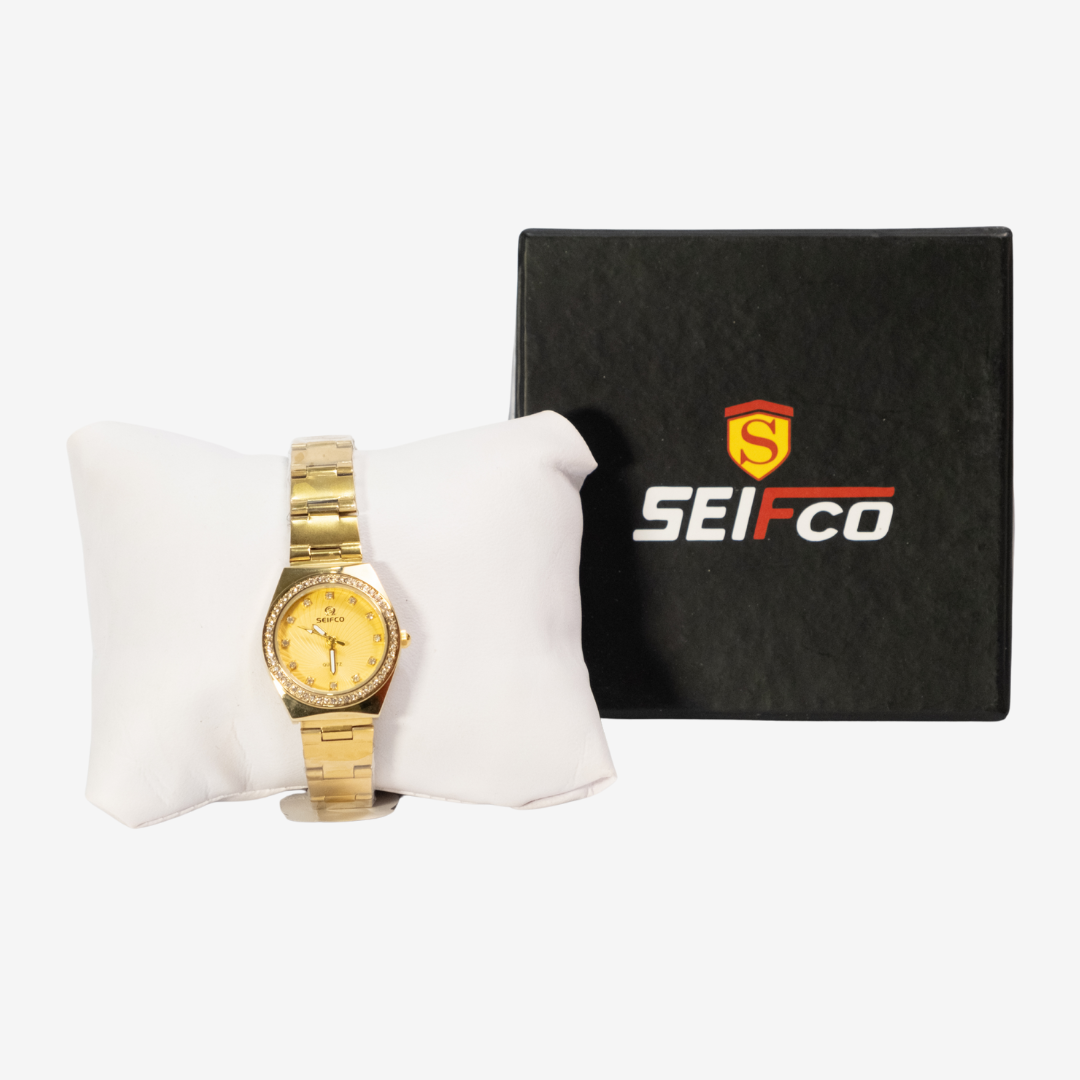 Add a touch of glamour to your everyday look with the Seifco Women’s Watch. Featuring a 36mm gold stainless steel case and matching gold dial, this watch is decorated with sparkling crystal stones for a sophisticated finish. Its durable design and precise movement make it perfect for daily wear or special occasions, while the mirror-original finish ensures a premium look.Key Features