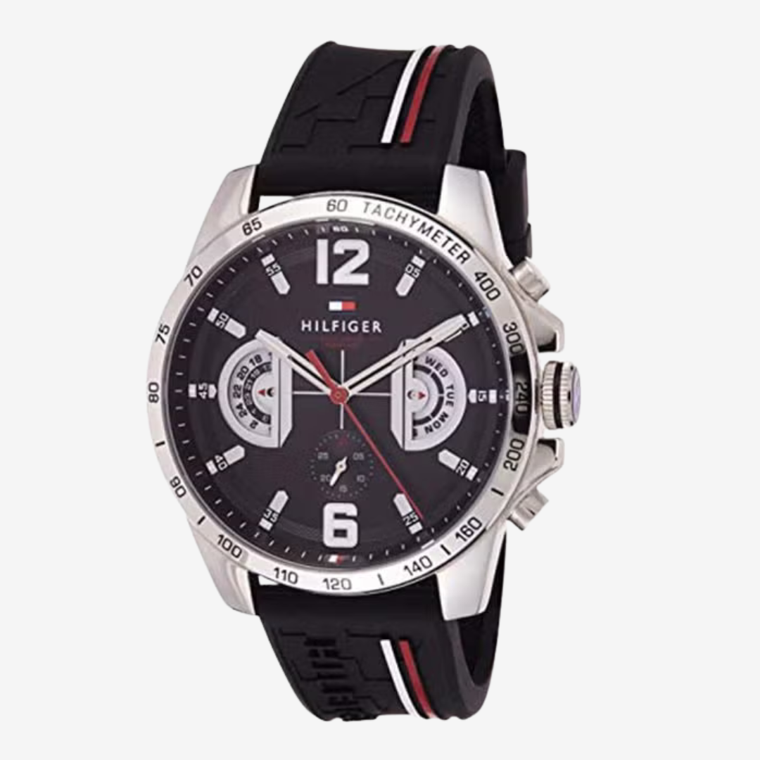 Upgrade your everyday style with the Tommy Hilfiger Decker 1791473 Men’s Watch. Featuring a sleek black dial and a durable black rubber strap, this 44mm Mirror Edition timepiece combines sporty elegance with reliable quartz precision, perfect for casual wear or office attire.